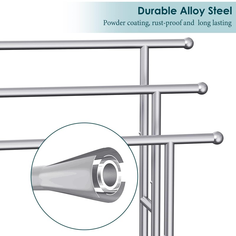 - Anti-slip Leveling Foot: Kayfia freestanding towel rack comes with four non-slip pads on the bottom that won't scratch indoor bathroom floors, weighted base makes towel rack stand more stable. Or move the quilt rack to an outdoor pool and keep it stable on uneven ground by adjusting the height of the foot pads.