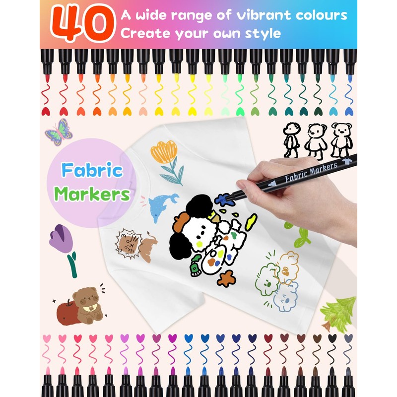 - Variety of creativity: our fabric set comes in 40 colours, with our textile pens machine washable, DIY becomes child's play. Perfect for painting bags, shirts, T-shirts, shoes, hats and more
