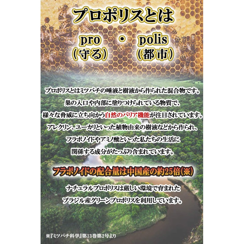 - 【品質・安全性へのこだわり】高品質なブラジル産プロポリスをたっぷり400mg配合しました。 厳しい環境で生成されるプロポリスには他の地域よりも多くの有効成分が配合されています。 また、最終加工は国内の厳しい基準をクリアした工場で行っています。
