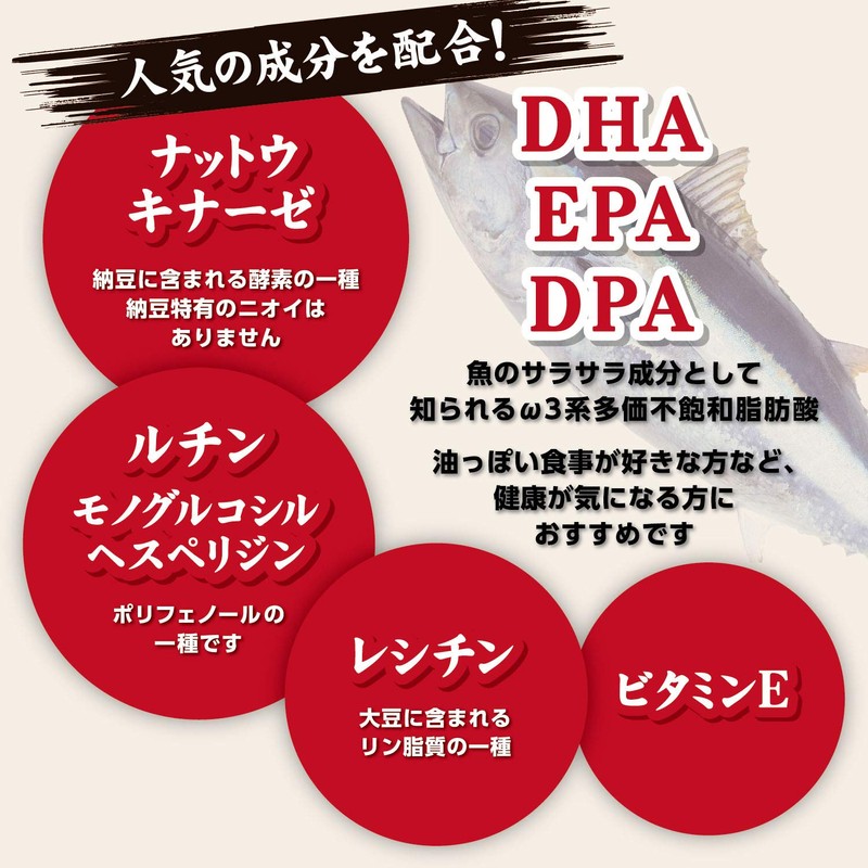 • DHA・EPA、ヘスペリジン、ルチン、ビタミンE、レシチン配合