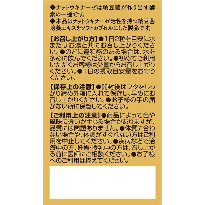 - 1日目安量2粒に納豆約100g(2パック分)相当のナットウキナーゼ活性が含まれています。