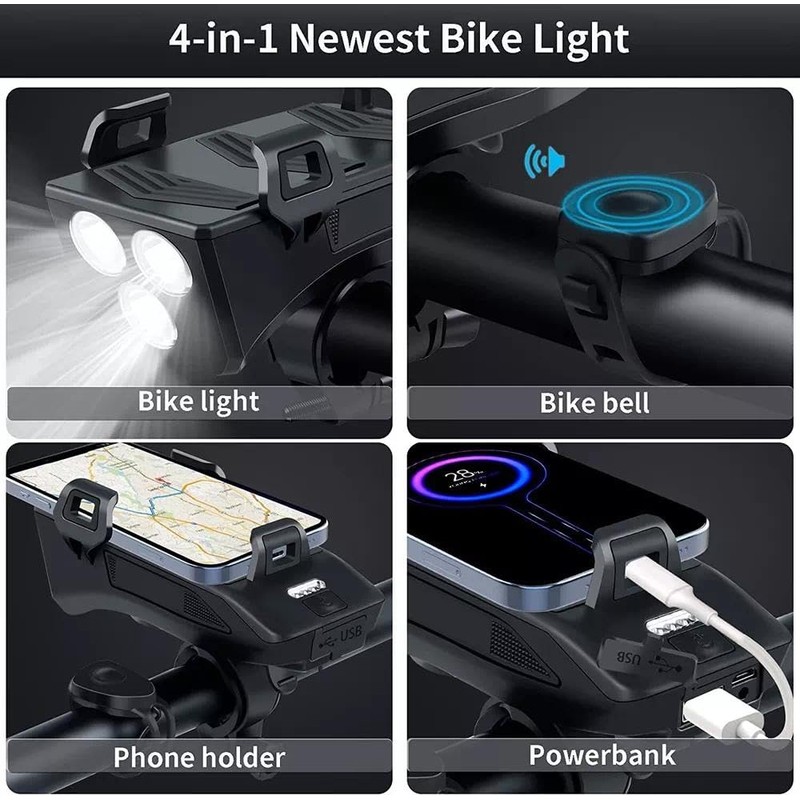 - 【Multi-Functional】This LED bike light set is versatile enough for cycling, hiking, camping, or any outdoor activity and can be used as phone holder, emergency flashlight and powerbank. And built-in horn with 5 sound modes, the highest decibel can reach 130dB, you can easily press the button to warn others in an emergency.