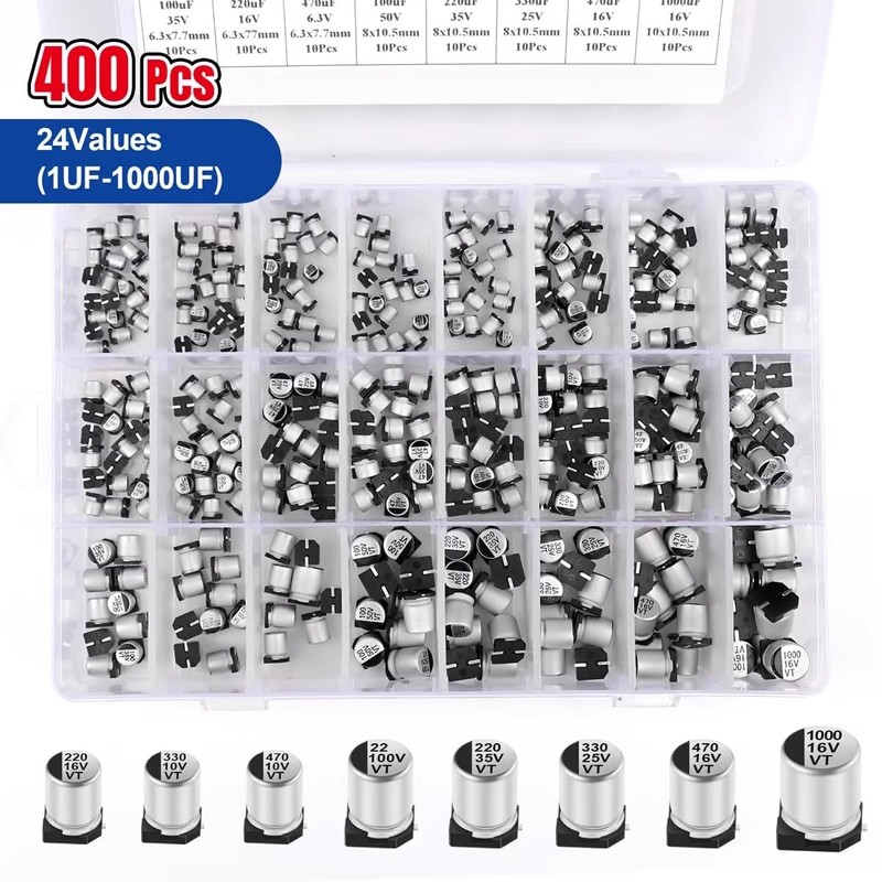 400PCS SMD Aluminum Electrolytic Capacitor Kit - 24 Values (1uF-1000uF) Assor...