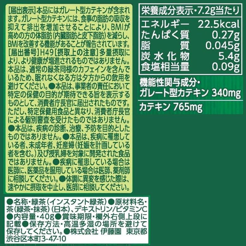 - 届出表示:本品にはガレート型カテキンが含まれます。ガレート型カテキンには、体脂肪を減らす機能があることが報告されています。