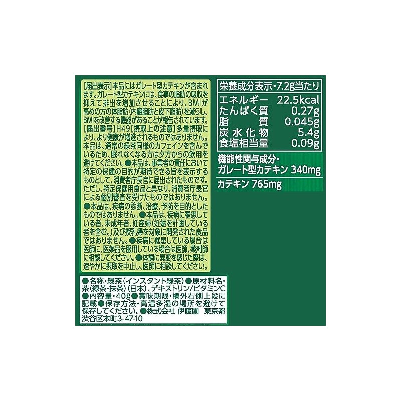 - 届出表示:本品にはガレート型カテキンが含まれます。ガレート型カテキンには、体脂肪を減らす機能があることが報告されています。