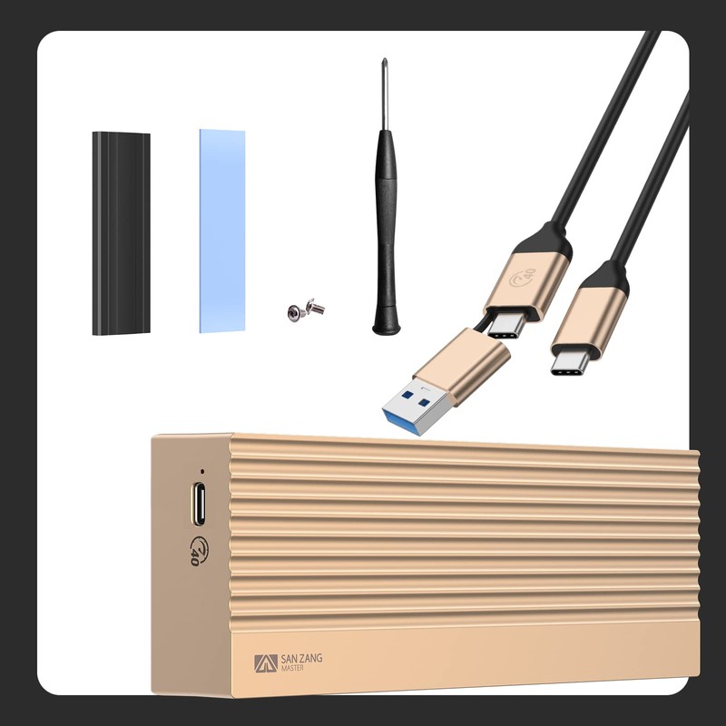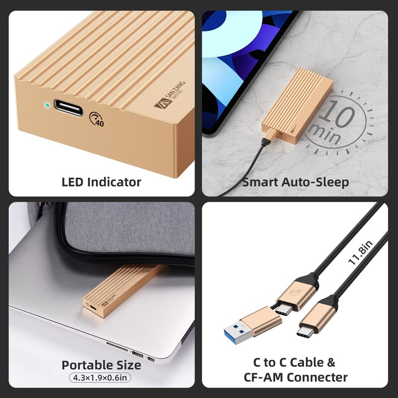 - 【Portable Storage】The USB C NVMe enclosure[4.25x1.96x0.64 inches] only weights 3.52 oz. Please NOTE: We provide upgrade 2-in-1 cable, it has 2 output ports, USB C to A (10Gbps) and USB C to C (40Gbps). The wire is 11.81 inches long, aluminum alloy interface and supports PD100W fast charging.