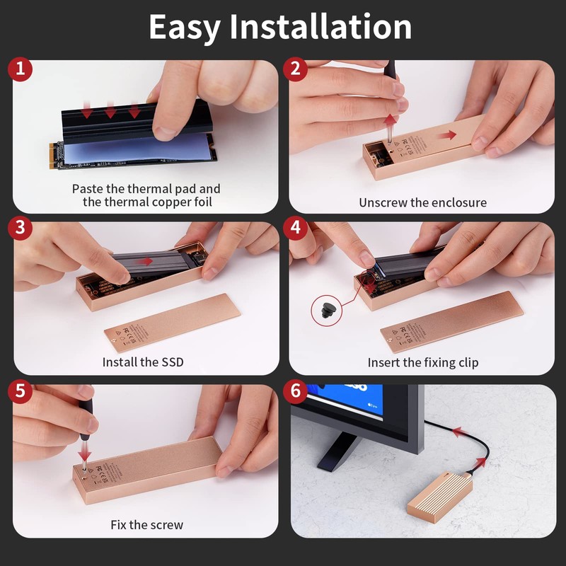 - 【Outstanding Triple Heat Dissipation】The slim, lightweight ssd enclosure is made of full aluminum alloy with CNC carving and sundblast anodized surface, resistance of scratches, dust and shock. The m.2 enclosure will keep your ssd in a cooler environment with triple heat dissipation of the metal shell, internal silicone pad and cooper strip. Easily install your ssd with just one screw fixed, then you can use it with no dirver needed, hot swapping, plug and play.