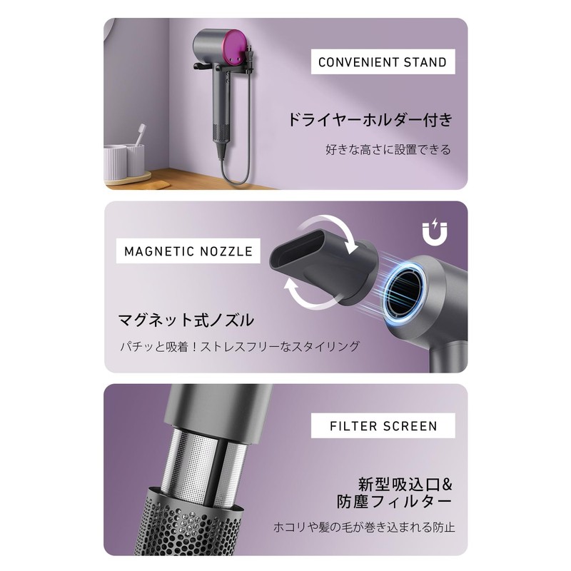 - 【贈り物に適すドライャーホルダー☆マグネット式☆防塵フイルター】 美しいパッケージに収められたこのドライヤーは、プレゼントに最適なスタイリッシュなアイテムです。付属のマグネット式ホルダーは「パチッ」と簡単に壁面に吸着!新設計の吸込口と防塵フィルターにより、ごみや毛髪の詰まりを防ぎ、メンテナンスも簡単。長期的に性能を維持できるのもポイント!ガラスや磁器面にも強力に吸着するので、浴室やドレスルームの収納スペースをスッキリと整えられます。使い勝手抜群の機能とエレガントなデザインが融合したこの商品は、大切な人に贈る心温まるプレゼントに最適です。