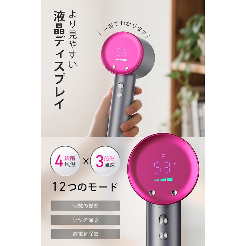 - 【便利なスマートディスプレイ表示温度/風量/イオンマーカー】 ヘアドライヤーが革新的なスマートディスプレイを搭載!液晶ディスプレイを見やすくしたことで目立ちやすくなりました。温度・風量・イオン状態が一目で確認できる直感的デザインで、カスタマイズした設定を視覚化します。4 段階の温度設定と3 段階の風量を組み合わせた全 12 パターンのモードを備え、柔らかい髪質から硬い髪までさまざまなニーズに合わせて最適な条件を選べます。特に染めパーマ後の傷んだ髪は低温モードで優しくケアでき、朝バタバタ時は強風量モードでスピーディードライが可能です。イオンマーカーが点灯するとマイナスイオンが放出中で、髪のカサつきを抑えながら光沢をプラスする、スマートでスタイリッシュなドライ体験をお届けします。