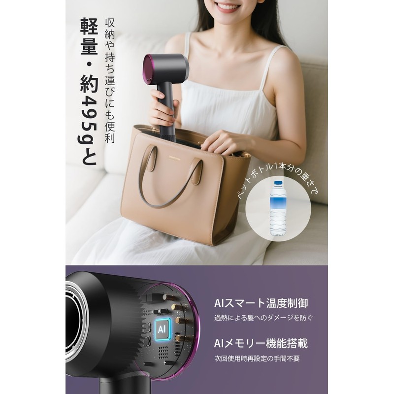 - 【超インテリジェントAIを搭載メモリー機能☆スマート温度制御過熱】 マイナスイオンヘアドライヤーはメモリー機能が機能を搭載します。普段使う温度・風量を 1 クリックで再現できるので、毎回の設定を繰り返す手間が省けます。忙しい朝でも起きている時間はそれほどかかりません。ヘアドライヤーに、超高速温度検知を行うAI インテリジェント温度制御システムを搭載。常に最適な温度バランスを維持しながら、髪への熱ダメージを最大限に軽減します。さらに、過熱防止機能と二重回路保護機能を組み合わせた二重安全機構を採用。異常発熱時に即座に自動停止するだけでなく、基板とモーターの温度を独立して監視することで、徹底した安全設計を実現。安心してご使用いただける仕様となっています。