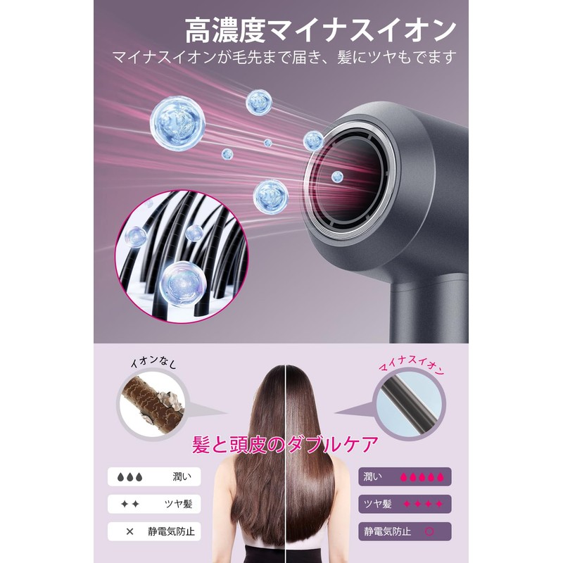 - 【高濃度マイナスイオン乾燥ない☆静電気防止】 高濃度マイナスイオンヘアドライヤーは、イオンを放出することで髪の静電気を中和し、髪の乾燥やもつれをを軽減し、なめらかに整えます。同時に毛小皮を閉じて水分と栄養をしっかりと閉じ込め、熱ダメージを低減し、染め毛やパーマのケアにも適しています。低温気流と組み合わせることでドライ効率が向上し、吹乾時間を短縮できます。さらに空気中の埃を吸着して頭皮環境を整え、髪の光沢を高め、ヘアスタイルの持続性を向上させます。乾燥肌や静電気に弱い方、頻繁に染めパーマをする方におすすめです。