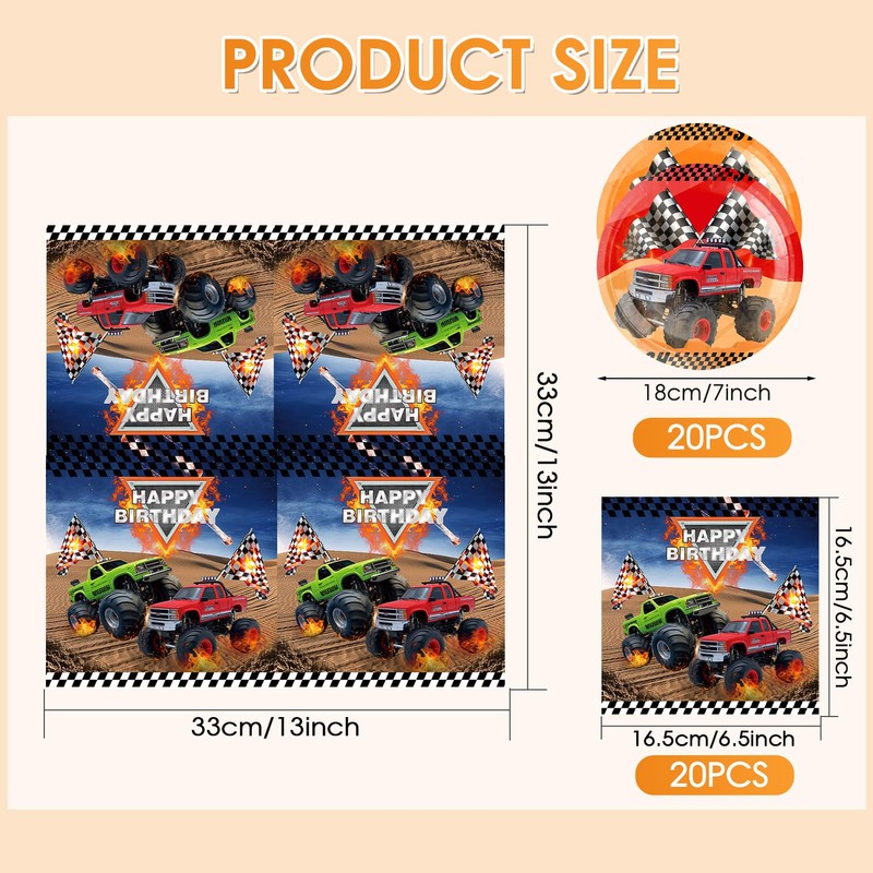 - 【Serves 20 Guests】The monster truck disposable dinnerware comes with 7" monster truck plates *20, 6.5" napkins (4 layers)*20 .This plates set features all monster truck party theme elements. You can easily create a monster truck birthday party atmosphere for your kids and family.