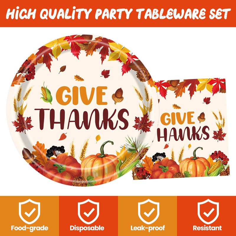 Fall Paper Plates and Napkins – Perfect for Autumn Celebrations! Elevate your seasonal gatherings with our fall paper plates and napkins set, the ideal choice for fall party decorations and festive meals. The 40pcs disposable dinnerware set includes 9-inch plates and coordinating napkins, designed with charming autumn motifs like pumpkin, maple leaf, and warm tones—perfect for creating a cozy atmosphere. Whether you're hosting a Thanksgiving tableware set-up, a Friendsgiving party supplies spread, or a casual autumn get-together, these disposable plates and napkins make cleanup effortless while adding a touch of seasonal charm. The sturdy paper plates hold hearty portions, and the soft napkins complete your table setting with style. Why Choose Our Fall Dinnerware set? ✅ Convenient – No washing, just enjoy your party! ✅ Festive Designs – Pumpkin and maple leaf patterns for a warm autumn vibe. ✅ Great Quantity – 40 pieces ensure you have enough for 20 guests. Perfect for indoor or outdoor use, this fall paper plates and napkins set is a must-have for hassle-free entertaining! 🍂