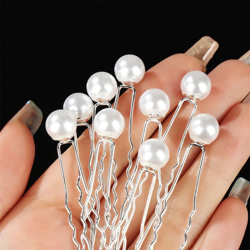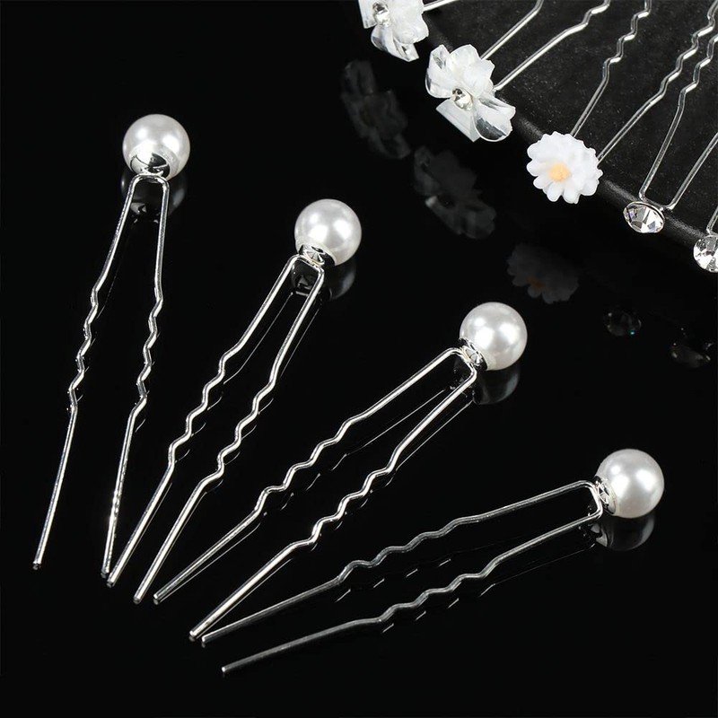 - Material:Elegant U-shaped hairpins with rhinestone and pearl embellishments