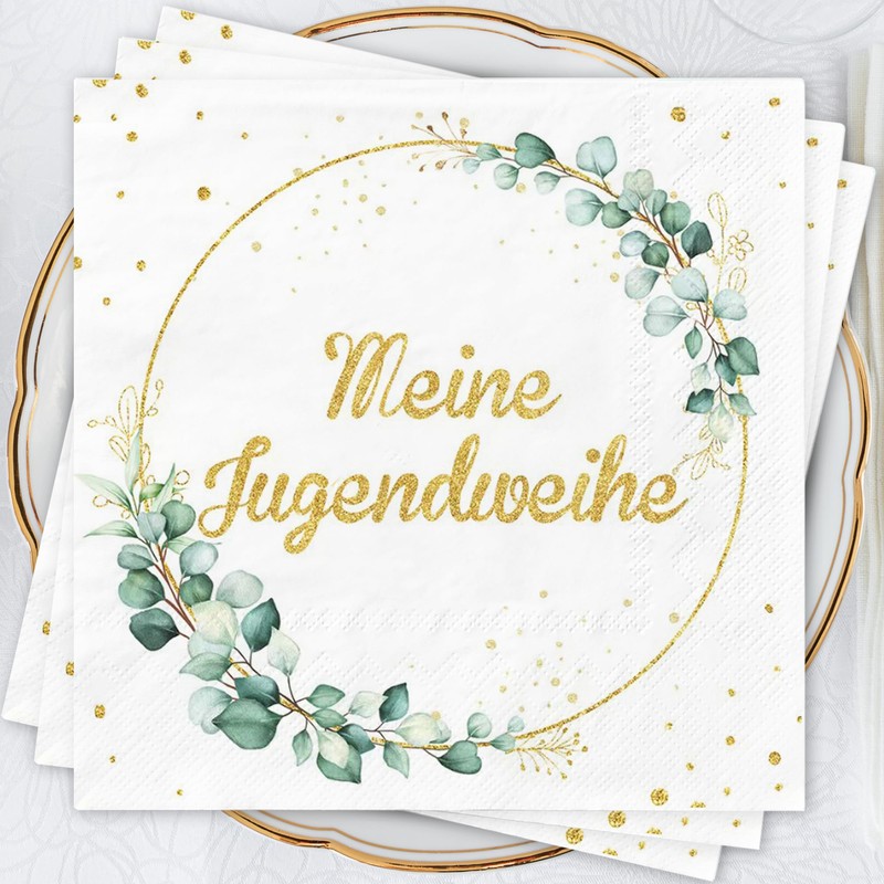 - 【Hochwertiges Eukalyptus Servietten Jugendweihe】: Stilvolle Tischdekoration! Das zarte Design mit einem Kranz aus Eukalyptusblättern und funkelnden goldenen Akzenten macht diese Papierservietten zu einem echten Hingucker. Sie passen perfekt zu jeder modernen und festlichen Tischdekoration.
