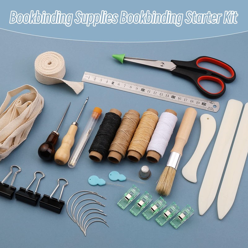 • Bookbinding Kit Includes: 4 rolls of waxed thread, 3 bone folders, 1 gourd awl, 1 brown hairbrush, 1 steel ruler, 6 pointed hand sewing needles, 4 size curved needles, 1 needle bottle, 1 needle tip stopper, 5 bulldog clips, 3 black binder paper clips, 2 rolls of binding ribbon, 1 thimble, 2 needle threaders, 1 scissors.