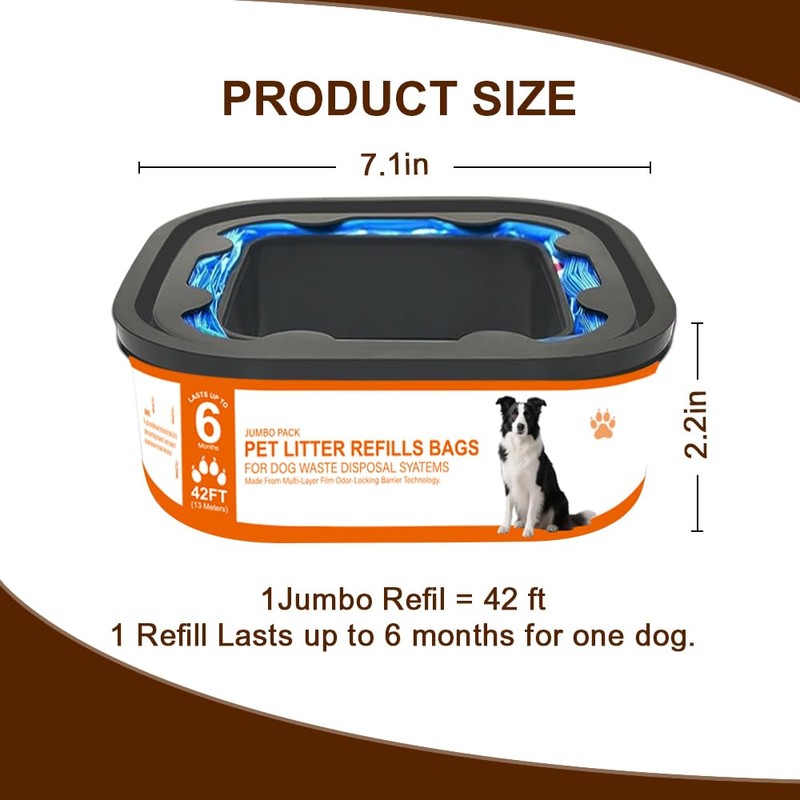 - Compatibility: Jumbo Refill Pet Waste Bags are perfectly compatible with Pet Dogs Genie Dog Waste Disposal System Pails. Each 42 FT long refill can last up to 6 months for a single-pet household, offering extended convenience and value.