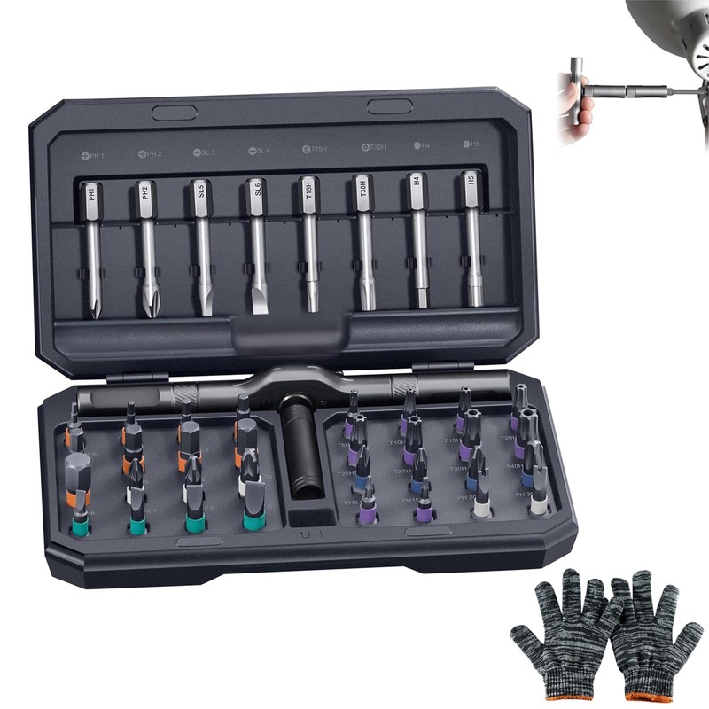 - 【42 in 1 Magnetic Screwdriver Set】: This screwdriver set also includes an ergonomic aluminum T-handle for comfortable grip,ratcheting screwdriver set includes 8 pcs 45mm long screwdriver heads and 32 pcs 25mm short screwdrivers (PH, SL, Torx, Hex, PZ, U-shape and more). It can help you easily complete various household tasks, such as furniture assembly, household appliance maintenance, bicycle fixing, and other repair work.