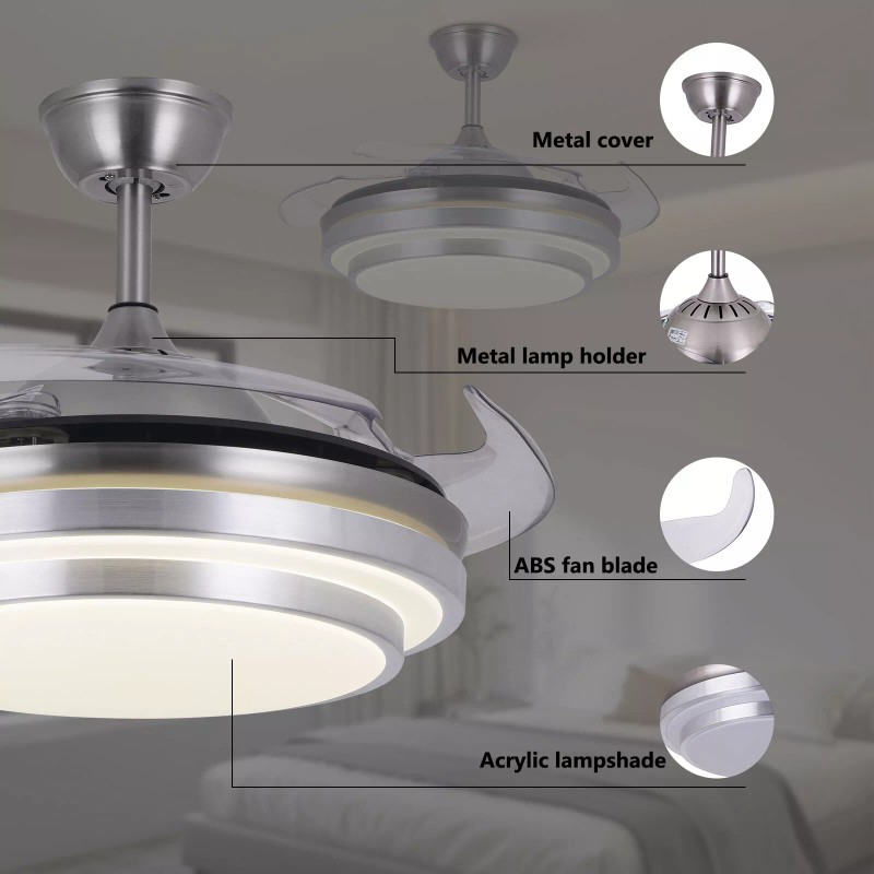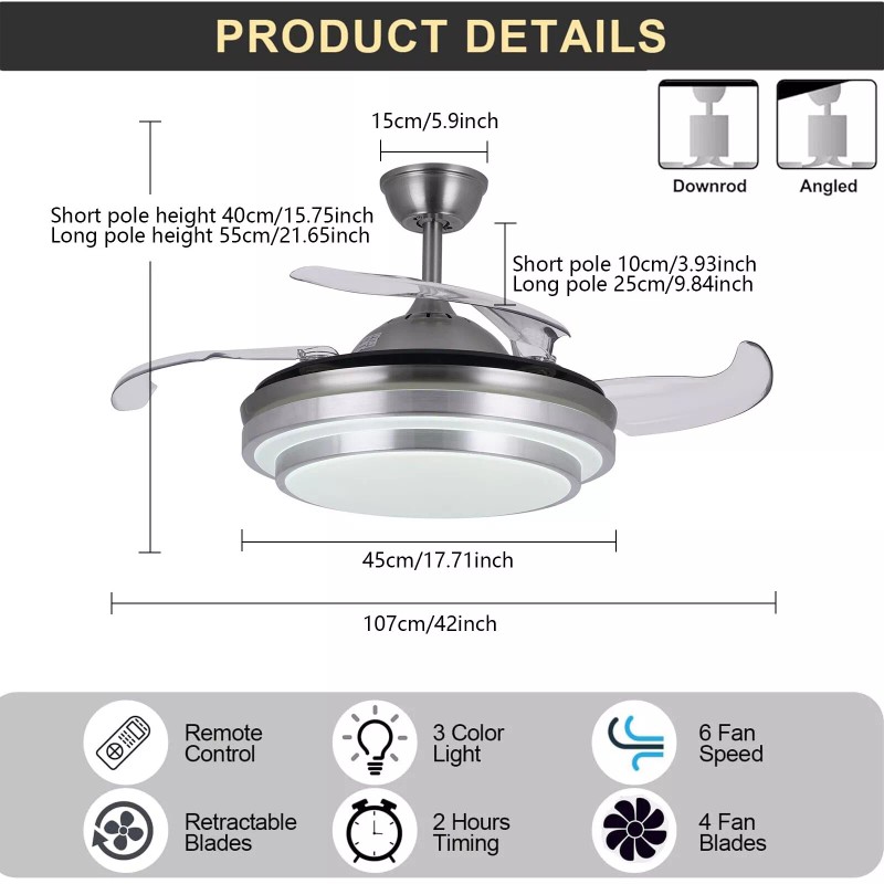 42" Retractable Ceiling Fan Lamp Dimmable LED Chandelier w/ Light Remote Control