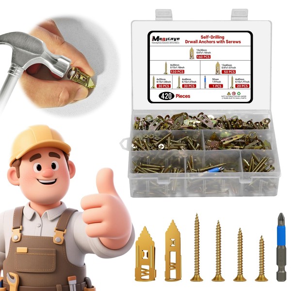 420 Pcs Self Drilling Drywall Anchors with Screws Kit, Zinc Plated Steel Wall Anchors and Self Tapping Screws Heavy Duty, No Drill Or Holes in Wall, for TV, Shelf Straps, Bike, Cabinets