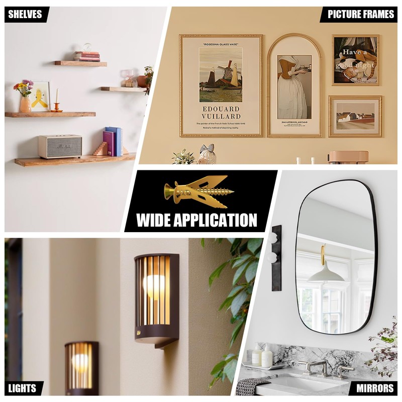 Wide Range of Applications: Suitable for gypsum board, lightweight brick, hollow brick, dry wall and other materials. Use to hang picture frames, curtains, wall lights, TVs, clocks, plants, bicycles, shelves, cabinets, paintings, bookshelves, blackboards and more.