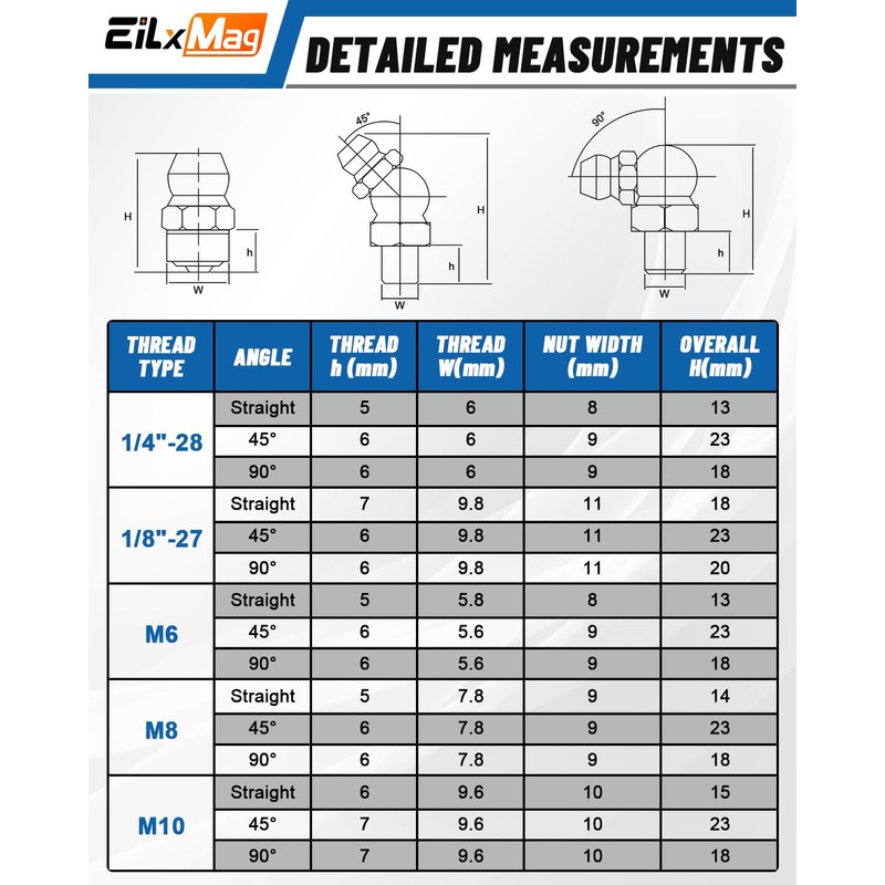 - SUPERIOR QUALITY: EilxMag grease zerk fittings are made of durable 45# structural steel for better corrosion and rust resistance. Designed for demanding environments, they ensure long-term durability in industrial, automotive and outdoor applications