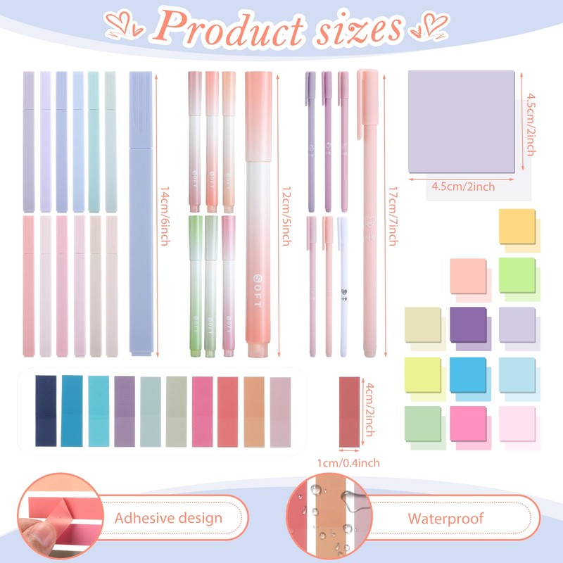 You will receive aesthetic school supplies that includes colored highlighters, gel pens, and pencils, along with sticky notes and index tabs, providing sufficient tools for your daily learning and work needs.