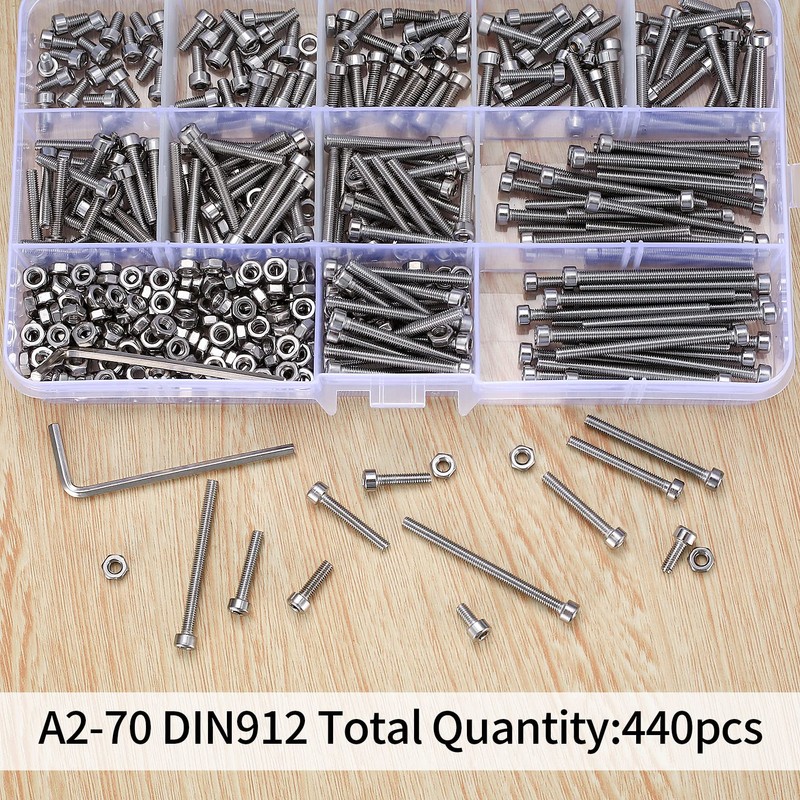 440 Pcs M3 Bolts and Nuts Set, Hex Socket Button Head Cap Screws Bolts Nuts Assortment Kit, Stainless Steel Replacement Machine Fastener Screws Bolts Nuts Sets