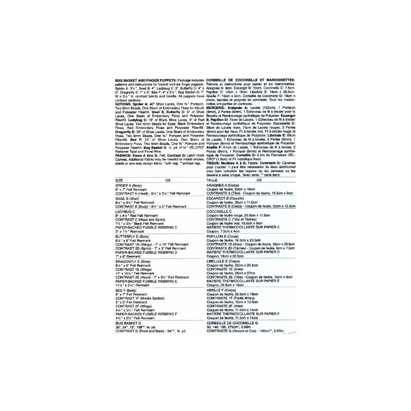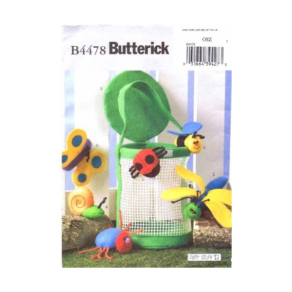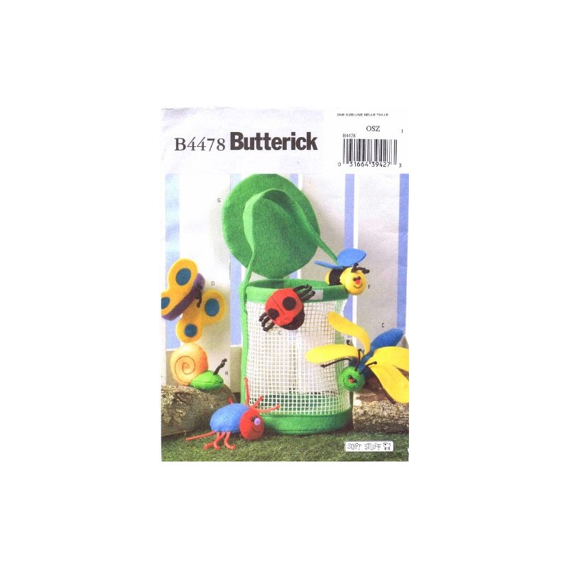 Butterick 4478 Sewing Pattern Bug Basket and Finger Puppets: Package includes patterns and instructions for basket and six finger puppets. Spider A: 3 1/2". Snail B: 4". Ladybug C: 3". Butterfly D: 4" x 6". Dragonfly E: 7" x 8". Bee F: 4" x 3 1/2". Bug Basket G: 7" W x 9 1/2" H, contrast bands and handle. All puppets have contrast sections.