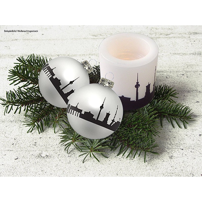 • Box contents and quality. 2 candles wax windlights London silhouette in plum, long burning time 20 hours, odourless, 8 cm height and diameter. The skyline motif is individually decorated by hand on the white candle.