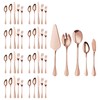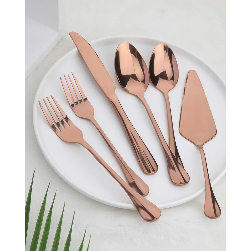 • ROSE GOLD FLATWARE SET for 8, 40 piece flatware set includes 8 place forks, 8 salad forks, 8 place spoons, 8 coffee/tea spoons, and 8 place knifes, Additional 5-piece serving set, Meet the cutlery needs of your family's daily meals. packaged in a nice box, perfect gift for wedding, housewarming, thanksgiving and Christmas.