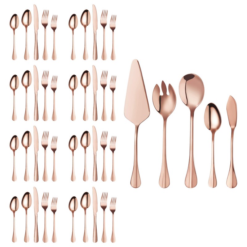 - ROSE GOLD FLATWARE SET for 8, 40 piece flatware set includes 8 place forks, 8 salad forks, 8 place spoons, 8 coffee/tea spoons, and 8 place knifes, Additional 5-piece serving set, Meet the cutlery needs of your family's daily meals. packaged in a nice box, perfect gift for wedding, housewarming, thanksgiving and Christmas.