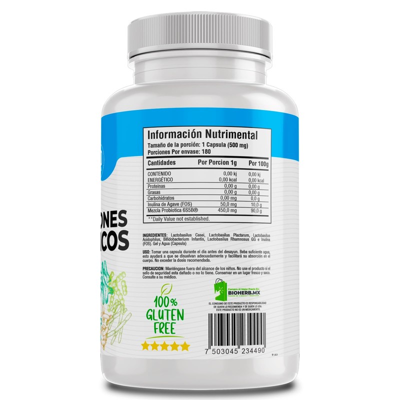 BioHerb Probióticos 450 Mil Millones es mucho más que una simple fórmula, es un conjunto de seis cepas probióticas cuidadosamente seleccionadas para transformar tu salud intestinal. Con una potencia extraordinaria de 5 mil millones de UFC en cada cápsula. Esta fórmula avanzada no solo ofrece seis cepas probióticas esenciales, sino que también se enriquece con Inulina de Agave.