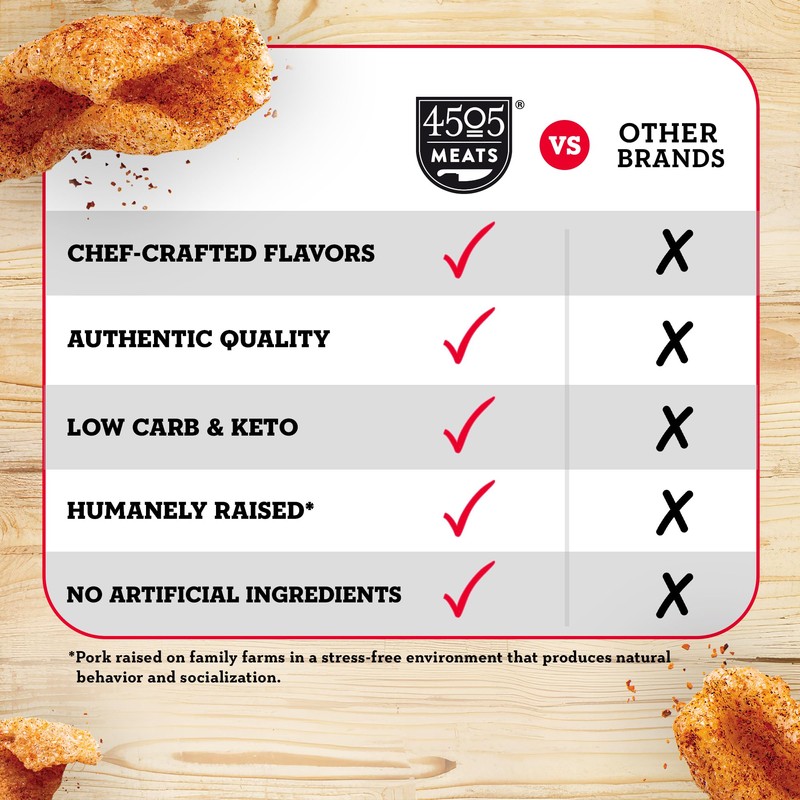 - Gluten-Free: 4505 Pork Rinds are paleo and naturally gluten-free, offering a satisfying snack that fits a variety of dietary preferences without compromising on bold flavor.