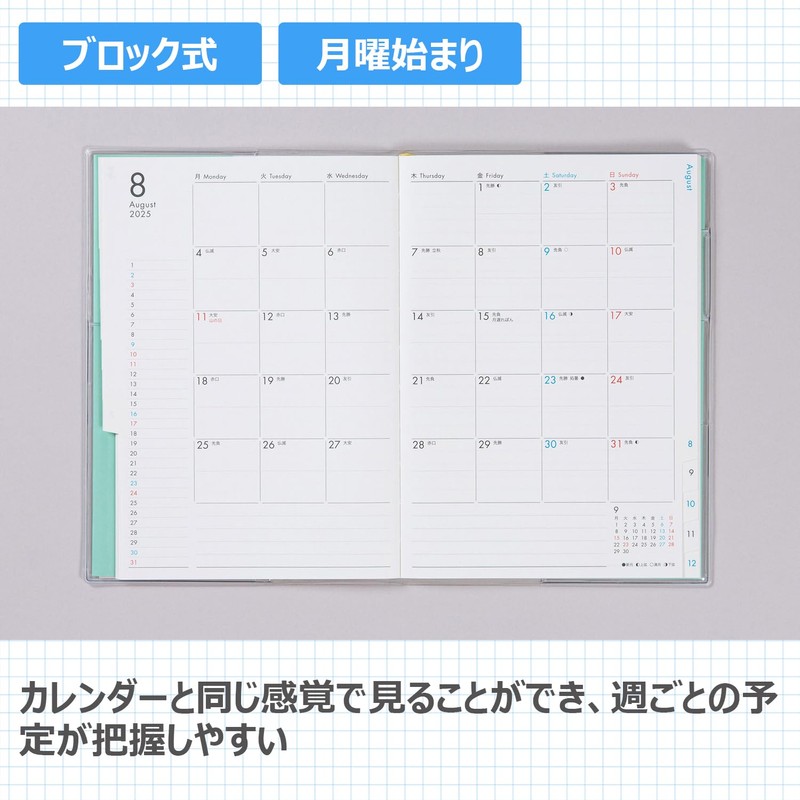 - Monthly Planning Column: Block Type: This block type allows you to see the same feel as a calendar, so you can easily track your weekly schedules. Begins on Monday with easy to write on weekend schedules. There are 2 pages of horizontal and grid notes behind each month from January to December. You can customize your own customization by writing down plans that are not enough for only the monthly pages, or holding memorabilia such as ticket stubs