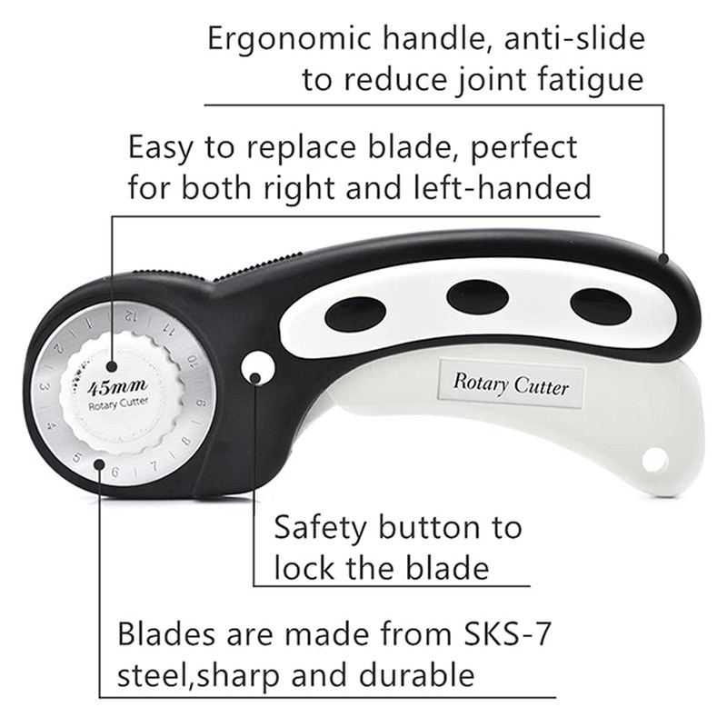 ♥ 45mm Rotary Cutter-- Ergonomically designed handle with soft-grip for comfort on both sides, anti-Slide & to Reduce Joint FatigueIt, has a safety button that locks the handle which can prevent the knife from appearing when not in use. It is simple to use and replace blade and the blade can be installed on both sides of the rotary cutter, perfect for both right and left-handed users.