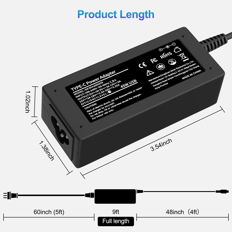 - 【Power Specifications】 Product POWER MAX : 45W AC Input: 100 - 240V 50 - 60Hz Output: DC 5V/3A 9V/3A 12V/3A 15V/3A 20V/2.25A Connector size: USB C/Type-C
