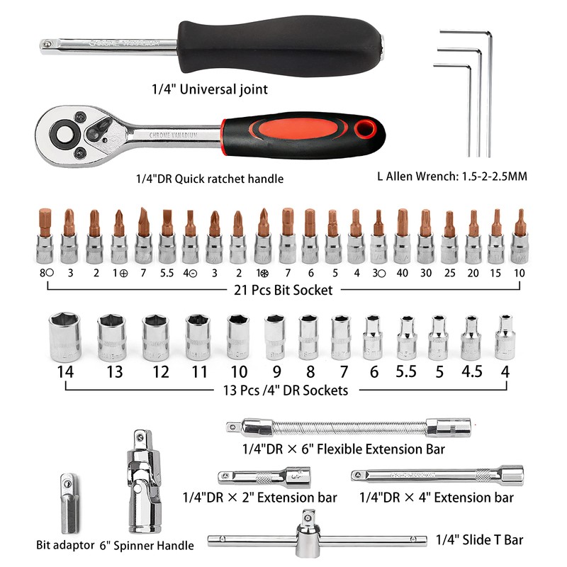 - 【Superior Quality】1/4 drive socket tool set are all made from premium quality chrome vanadium steel alloy. Chromium vanadium steel material has extraordinary hardness and excellent toughness, can withstand greater torque