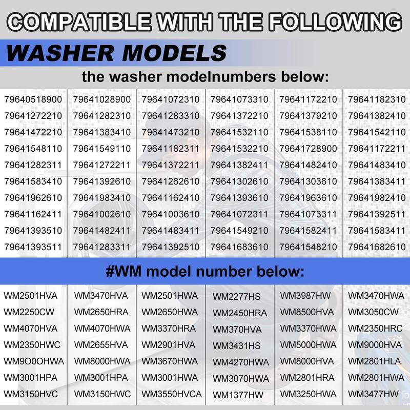 - Compatible Models Continued -- WM2250CW, WM2450HRA, WM3987HW, WM3470HVA, WM3470HWA, LSWF388HVS, WM3550HVCA, WM2455HG, WM2277HB, WM2487HRMA, 48231009799, 48231010108, CW2079CWD, CW2079CWN, F1201FD, F1201FD1, F1201FDP, F1201FDP1, F1216FDS, F1216FDS1, F1253FDS, F1253FDS3, F1254FD, F1254FD1, F1254FD3, F1305FDM, F1314FDS