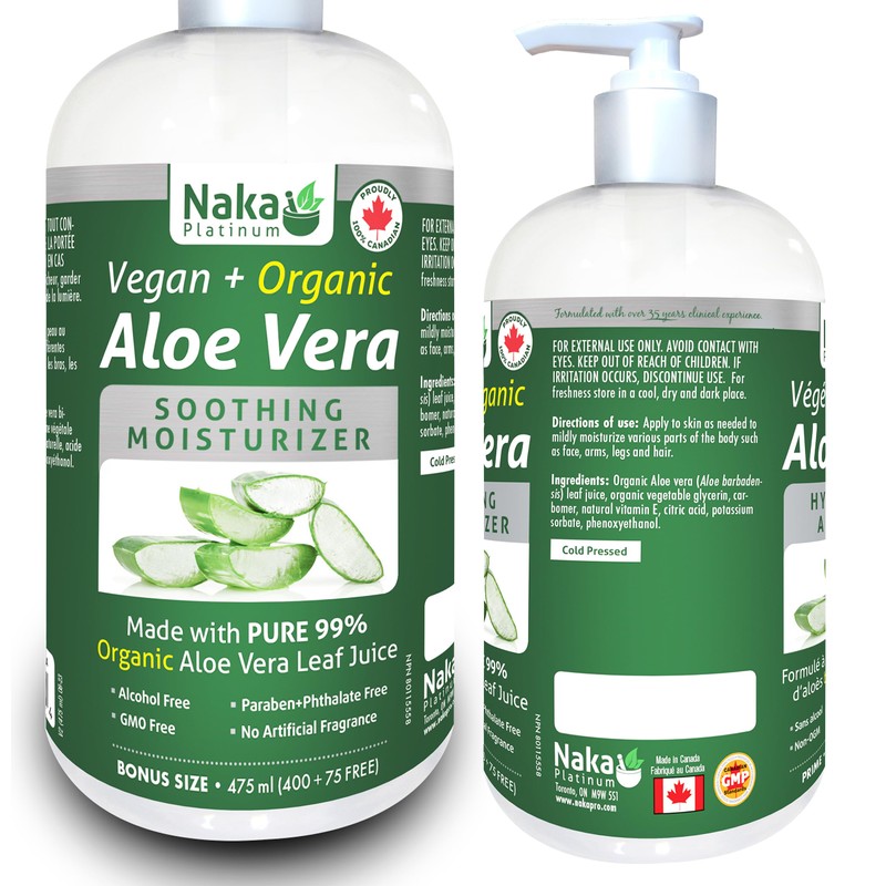 475ml (16oz) ORGANIC Aloe Vera, Vegan + Soothing Moisturizer, 99% PURE, Cold Pressed, Made in Canada