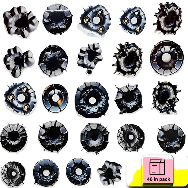 - Realistic Gunshot Effect: This 48-pack of bullet hole stickers provides an ultra-realistic gunshot appearance to add an edgy, gritty vibe to any surface.