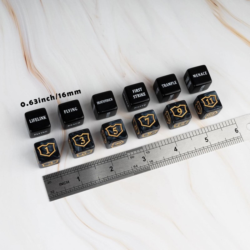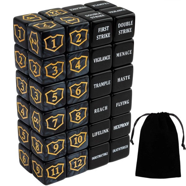 Package Include: Total 24pcs shield dice counters(12pcs 1~6 dice&12pcs 7~12 dice) and 24pcs black MTG keywords dice(FIRST STRIKE,VIGILANCE,MENACE,TRAMPLE,HASTE,DOUBLE STRIKE / LIFELINK,REACH,FLYING,HEXPROOF,DEATHTOUCH,INDESTRUCTIBLE) with velvet pouch.