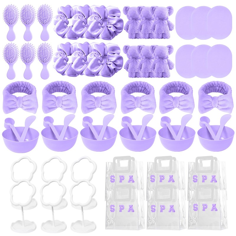 48 Pcs Purple Sleepover Party Supplies 6 Lovely Towel 6 Face Mask Mixing Bowl Set 6 Mirror 6 Headband 6 Scrunchies 6 Cleaning Sponge 6 Comb 6 Transparent Gift Bag for Spa Slumber Party Favors Supplies