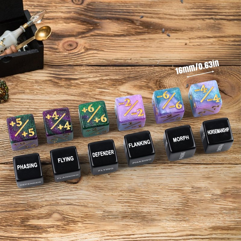 - WHAT YOU GET:24 pcs MTG keywords dice(AMPLIFY,AFFINITY,BUYBACK,SUNBURST,FLASHBACK ,BANDING,FLANKING,HORSEMANSHIP,DEFENDER,MORPH,FLYING PHASING),24pcs token dice counters(12 pieces -1~-6 counters & 12 pieces +1~+6 counters) with velvet pouch.enough for your daily game use and replacement, and even for your school, bar, and club games