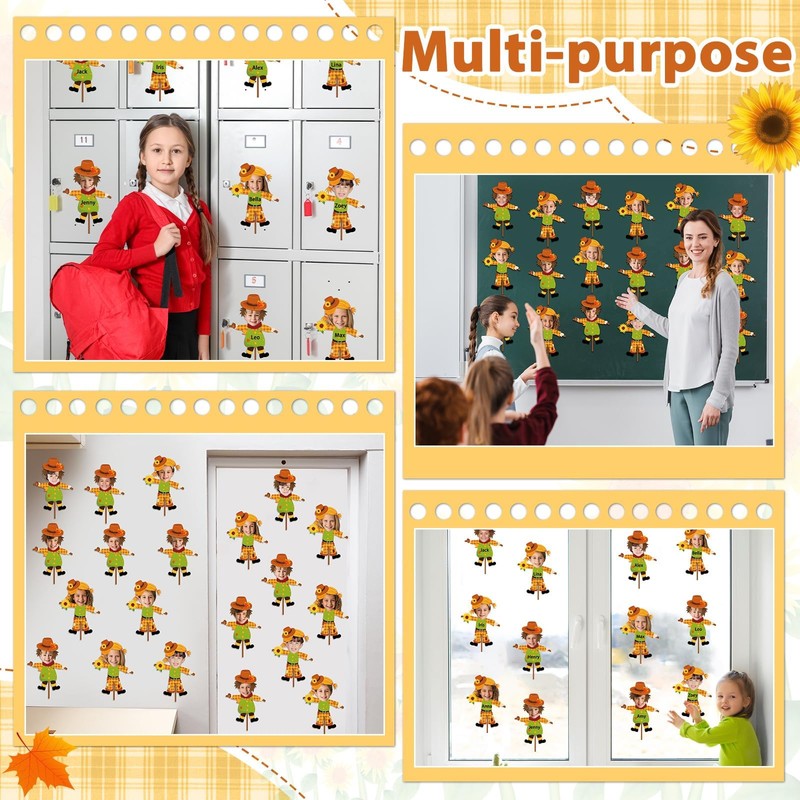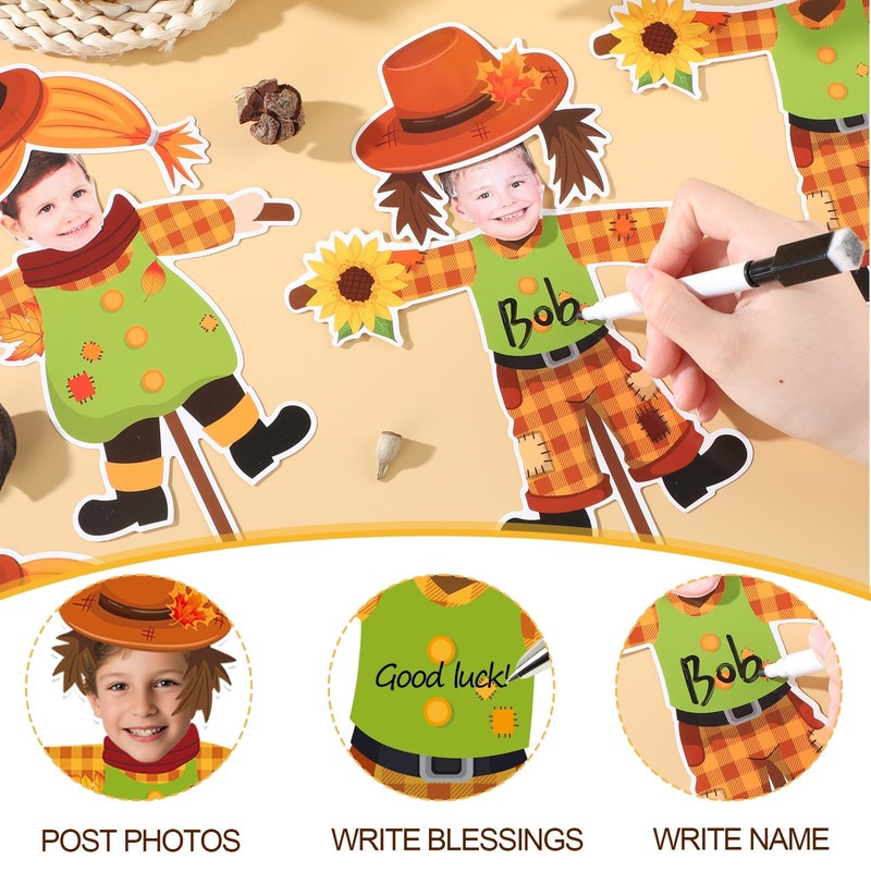 Bring cozy fall vibes into your classroom with this personalized scarecrow theme bulletin board kit. Each scarecrow cutout allows students to add their own photo (2.8 to 3.5 inches), turning simple decorations into meaningful scarecrow crafts for kids. Just peel and stick with adhesive dots - no extra tools needed. It’s a fun and engaging way to welcome the season.