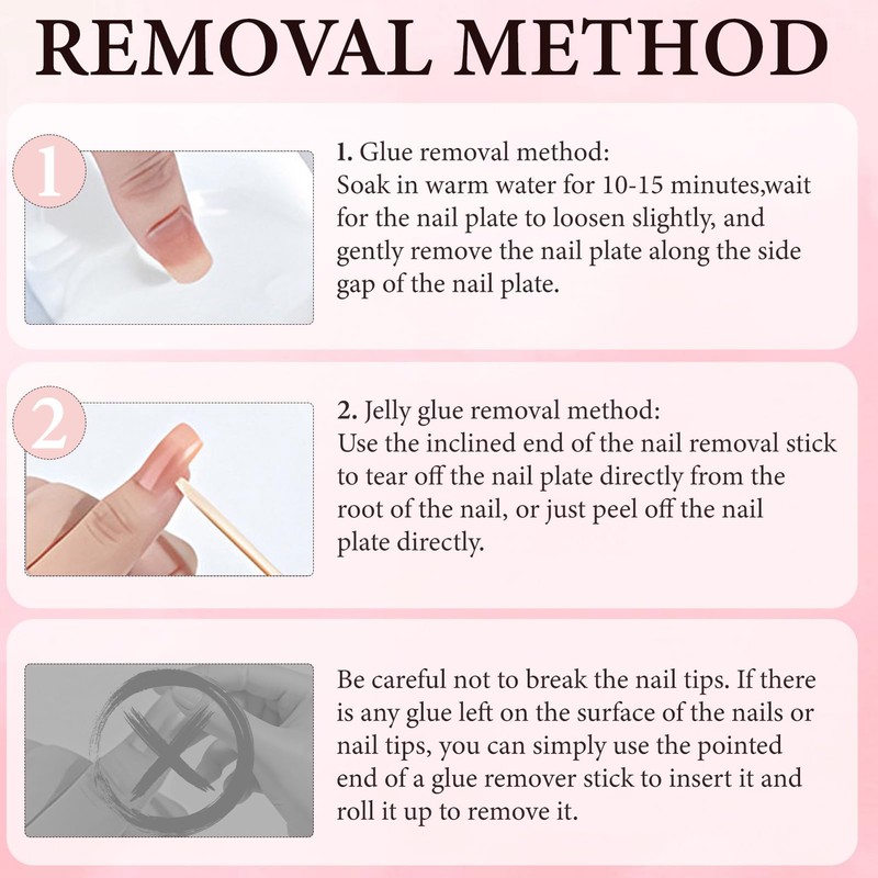 4. Zum Entfernen der künstlichen Nägel weichen Sie sie in warmem Wasser ein, um den Jelly-Kleber aufzuweichen, oder verwenden Sie ein Holzstäbchen. Aufgeklebte künstliche Nägel können mit professionellem Nagellackentferner oder Olivenöl entfernt werden.