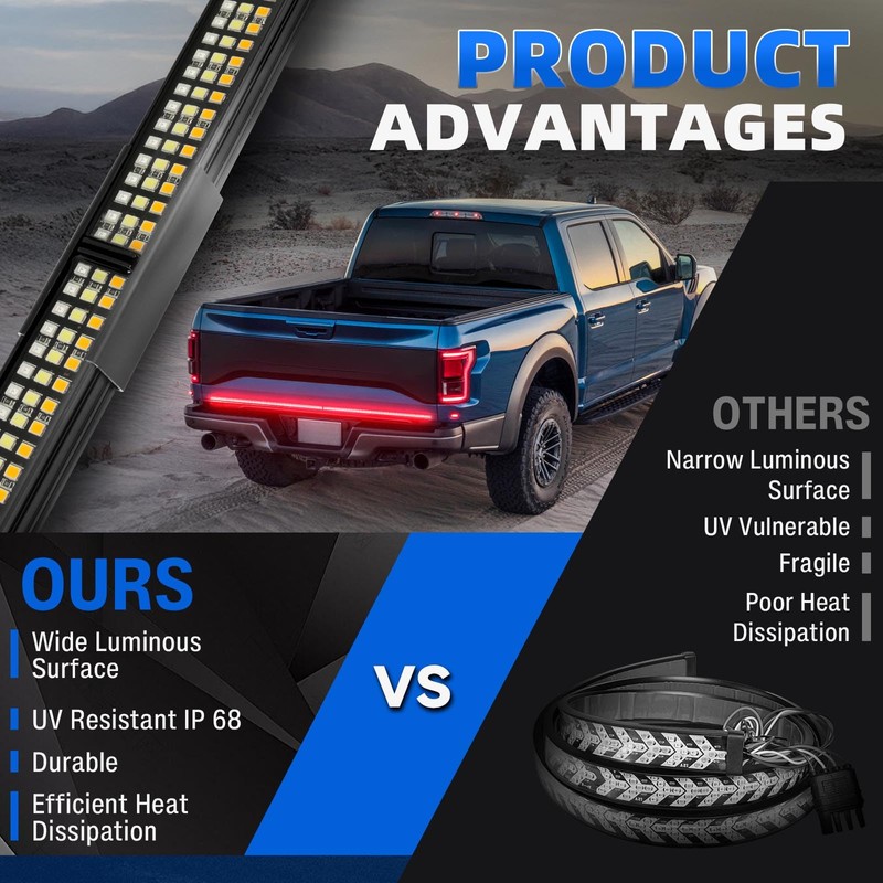 - 【Premium Material】Triple row led tailgate light bars are made of top quality aluminum material and IP68 waterproof rated silicone,water resistance,rust resistant,chemical corrosion,high and low temperature resistance, solid, high vibration resistance, high brightness and no radiation,can withstand any extreme weather and harsh environment.