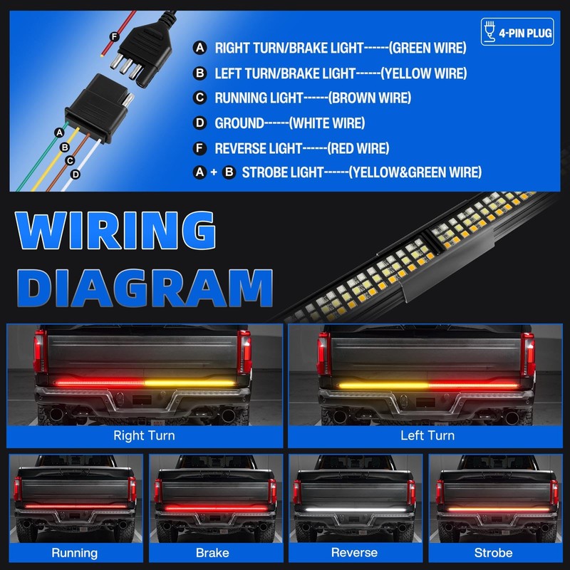 - 【Wide Application】The tailgate light strip measures 48 " and operates at DC 12V-16V wide voltage,suitable for most cars, trucks, Pickup, SUV, RV,Van,trailers etc.Compatible with Toyota Tacoma Tundra Hilux Nissan Frontier Ford Maverick Chevy Colorado Ford Ranger GMC Canyon Honda Ridgeline Jeep Gladiator etc.Note:For some vehicles that can't work normally, please connect 4-way flat connector wire harness (included) to flat 4 pin connector on strip light, then connect wires to existing truck wiring.