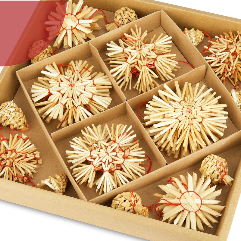 - Box contents: you will receive 48 x straw jewellery with 3.6 or 8 cm diameter. A real eye-catcher for your tree. Several special designs crafted with red twine Thanks to the eyelet, each star can be hung up.