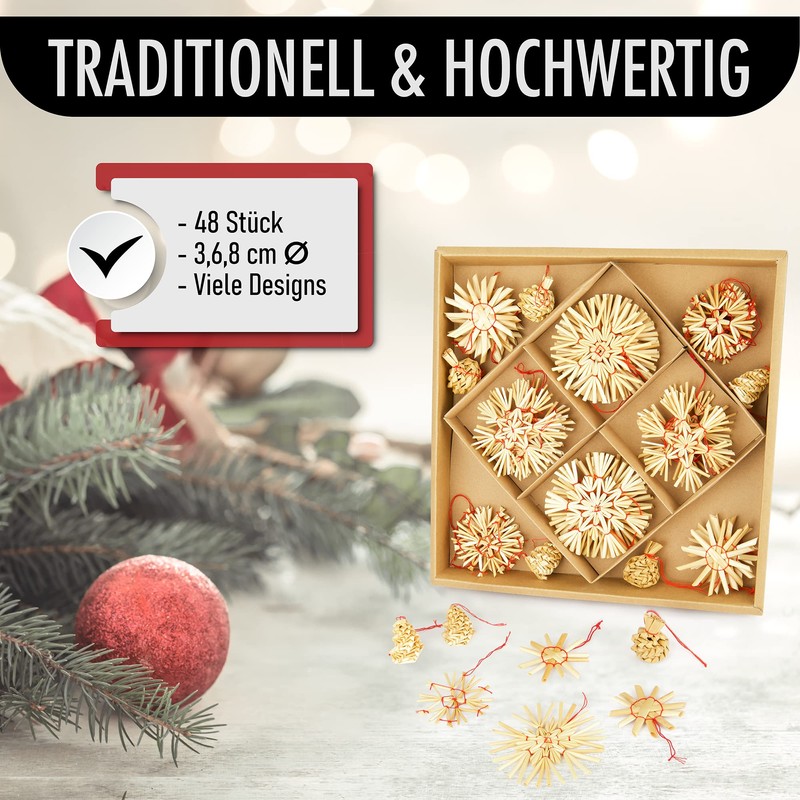 - Beautiful designs: 48 beautiful straw stars small each with 3, 6 or 8 cm diameter, high-quality as decoration for your Christmas tree. This straw Christmas decoration is particularly chic in combination with Christmas baubles and other tree decorations.